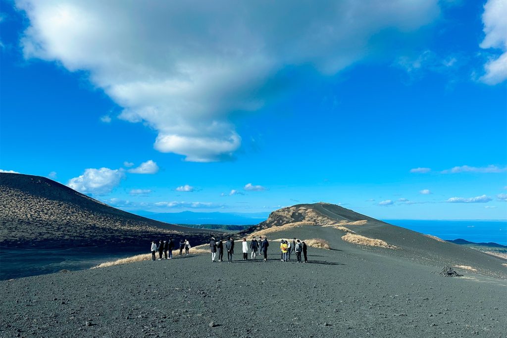 三原山の噴火で積もった黒いスコリアに覆われ、歩くたびに足元から心地よい音が響きます。